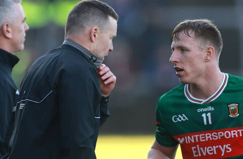 Mayo manager Andy Moran speaks with Ryan O'Donoghue during last Sunday's opening round league win over Galway. Photo: INPHO/James Crombie