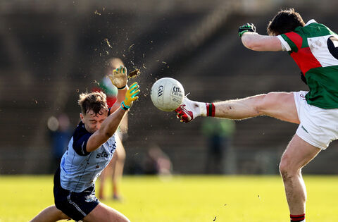 Mayo's Paddy Durcan has his shot blocked by Jack Lundy of Dublin at MacHale Park last Sunday. Picture: INPHO/Laszlo Geczo