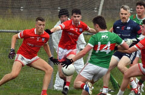 Niall Feeney of Ballina Stephenites shoots for the target but his attempt was subsequently blocked by his brother Daniel (in the background) during the Mayo SFL Division 1A match at James Stephens Park last Saturday evening. Pictures: David Farrell Photography