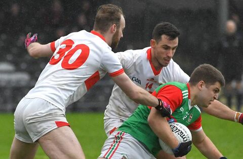 Ballina Stephenites’ James Doherty is surrounded by Coolera-Strandhill’s Leo Doherty and Niall Murphy during last Sunday's AIB Club SFC semi-final at Markievicz Park, Sligo. Picture: David Farrell Photography