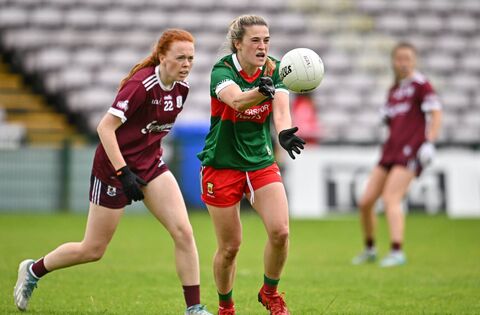 Danielle Caldwell of Mayo in action against Kate Slevin of Galway during the TG4 Ladies Football All-Ireland Senior Championship quarter-final match between Galway and Mayo at Pearse Stadium earlier this summer. Picture: Sportsfile