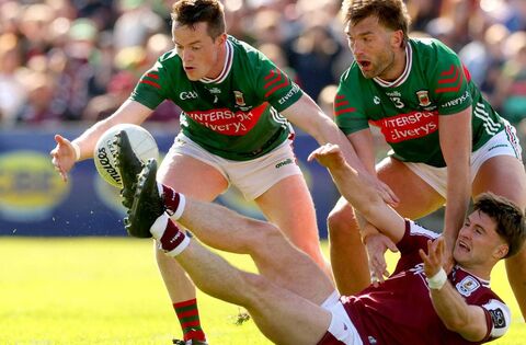 Stephen Coen and Aidan O’Shea apply pressure to Cathal Sweeney of Galway during Mayo's two points loss at Hastings Insurance MacHale Park in Castlebar last Sunday. Picture: INPHO/James Crombie