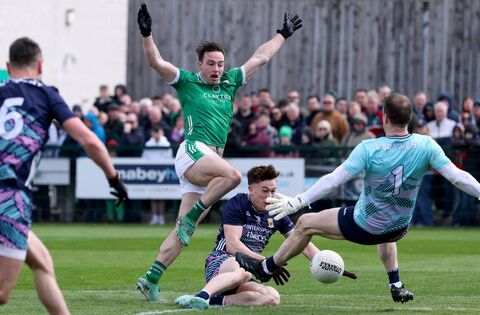 London's Micheál O'Reilly has his goal attempt blocked by Mayo defender Fenton Kelly as goalkeeper Rob Hennelly gets ready to assist. Picture: INPHO/Gerry McManus