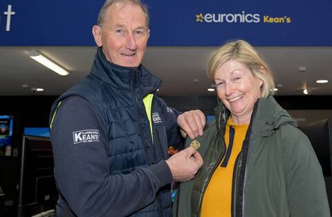 James Kean, centre-forward on the St Colman’s team that won the 1977 Hogan Cup, pins his winners medal, which he recently had converted to a broach, on his wife Patricia’s lapel, in the family shop in Claremorris. Picture: John Corless