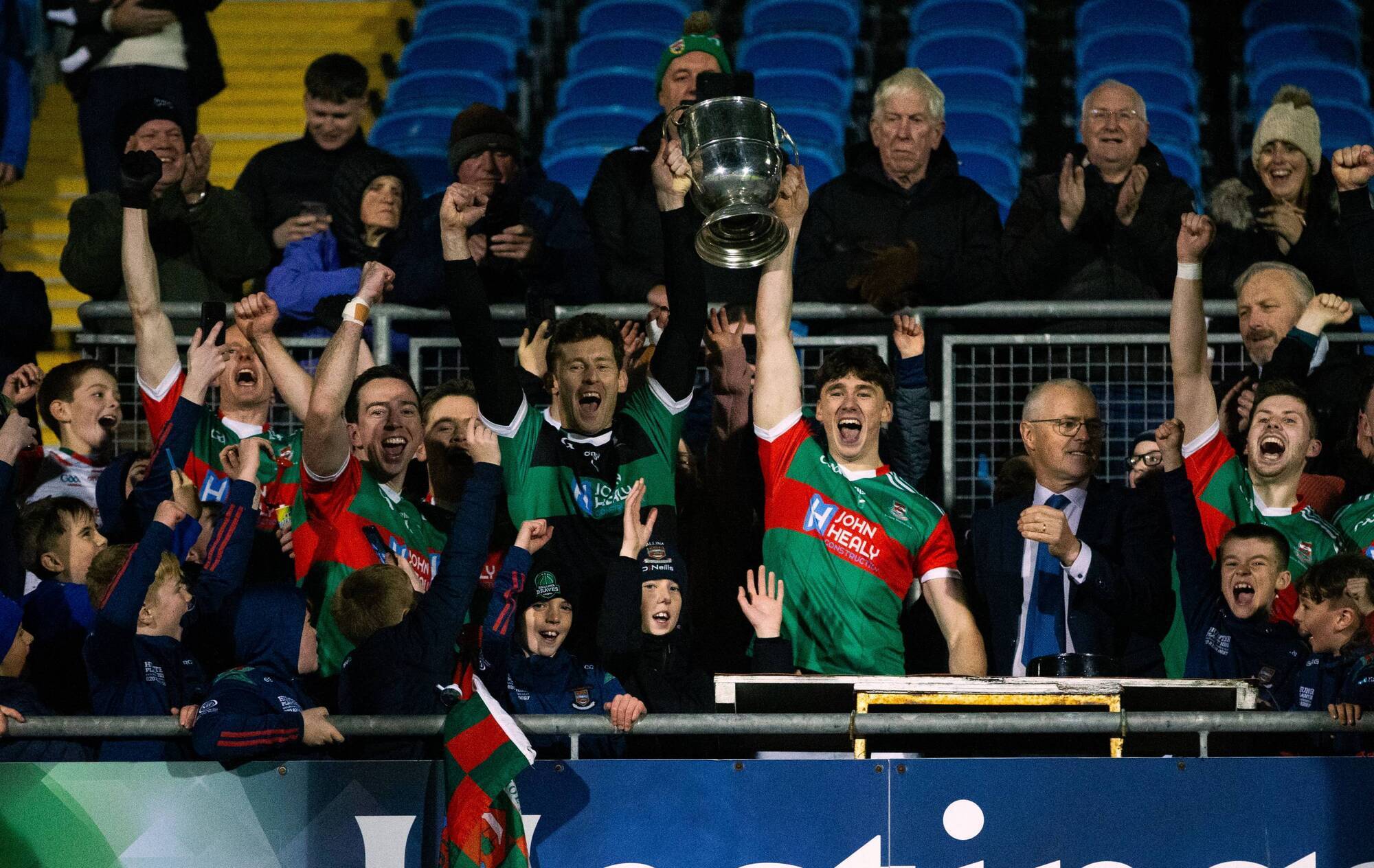 David Clarke and Sam Callinan lift the Paddy Moclair Cup following Balina Stephenites' victory in the 2024 Mayo SFC Final. Picture: INPHO/Tom Maher