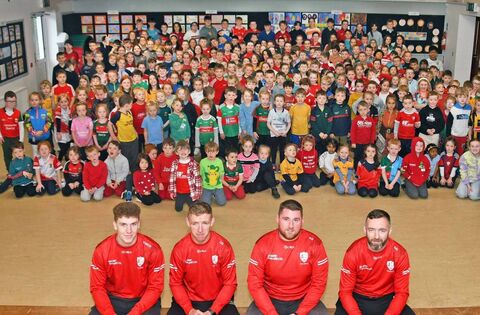 Moy Davitts players Cian McHale, Conall Quinn and Oisin Quinn with team selector Ronan Gilmore, second from right, at Foxford National School where Colours Day marked the achievement of local teams Moy Davitts and Knockmore reaching the finals of the county intermediate and senior football championship respectively. Picture: John O'Grady