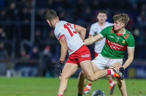 Mayo’s Rory Brickenden tackles Tyrone's Darren McCurry. Pictures: INPHO/Lorcan Doherty