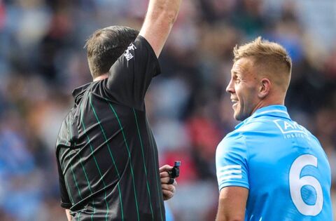 Referee Martin McNally shows a yellow card to Jonny Cooper during the 2022 All-Ireland SFC quarter-final between Dublin and Cork. Picture: INPHO/Evan Treacy