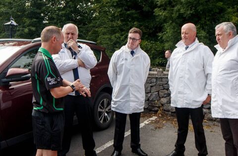 Referee Garryowen McMahon with umpires Kevin McDonnell, Patrick Tunney, Martin Tunney and Daniel Caldwell. Garryowen McMahon will referee the 2023 Mayo SFC final between Breaffy and Ballina Stephenites. Picture: INPHO/James Crombie