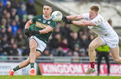 Mayo's David McBrien tries to block a foot-pass from Kerry's Joe O’Connor during the Division 1 game at Austin Stack Park, Tralee last Saturday. Picture: INPHO/James Lawlor