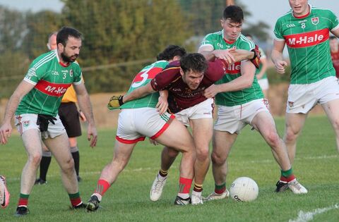 Liam Burke of Ballinrobe tries to force his way through the Kilmaine cover during last Friday night's intermediate championship clash at Flanagan Park. Picture: Andy Walsh
