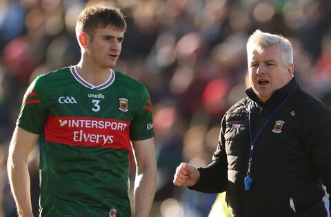 Rory Brickenden with temporary Mayo manager Stephen Rochford who has decided to recall the Westport defender for Saturday's clash with Tyrone.