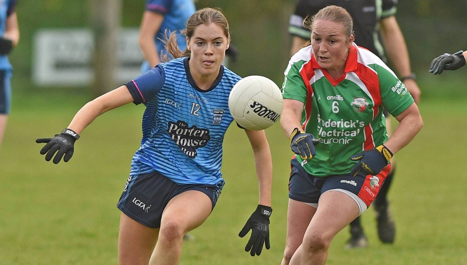 Westport's Fionnula McLaughlin in a race for the ball with Carnacon's Michelle McGing. Picture: Conor McKeown
