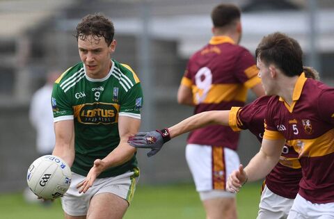 Ardnaree’s Jason Crean offloads the ball as Ballinrobe’s Sean Flannery closes in. Pictures: David Farrell Photography