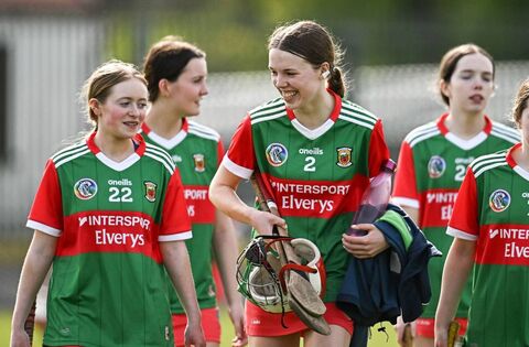 Mayo players, from left, Madison Galvey, Marissa Collins and Aoibhín Greally share a joke after their side's victory in the Electric Ireland All-Ireland Camogie Minor B Championship semi-final. Pictures: Sam Barnes/Sportsfile