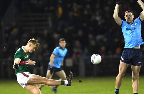 Dublin midfielder Brian Fenton is powerless to prevent Jack Carney from having this pop at the posts during Mayo's one-point victory in last Saturday's Division 1 clash at Hastings Insurance MacHale Park. Picture: David Farrell Photography