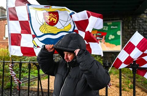 Merchandise seller Brendan Hogan shelters from the wind and rain before the recent All-Ireland IFC Club Final between Crossmolina Deel Rovers and Ballinderry of Derry at Croke Park in Dublin. Picture: Tyler Miller/Sportsfile