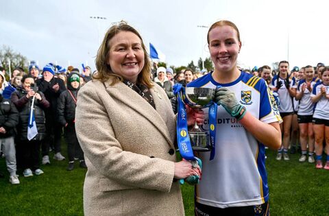 Ballinrobe Community School captain Ali Hughes is presented with the trophy by Trina Murray, LGFA President after the Lidl LGFA PPS All-Ireland Senior 'C' Championship final in Glenamaddy. Picture: Tyler Miller/Sportsfile