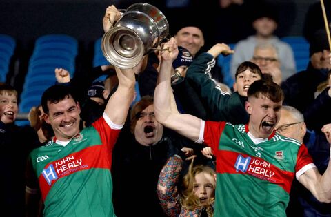 Ballina Stephenites’s Mike Murray and Dylan Thornton lift the Moclair Cup after defeating Breaffy in the Mayo SFC final. The Stephenites ended a 16-year wait although the overall final prompted much discussion. Picture: INPHO/James Crombie
