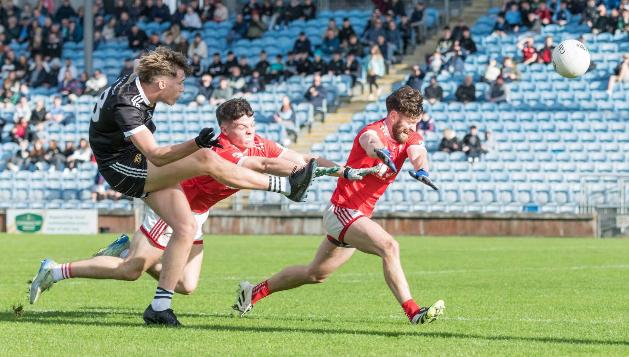 17-year-old substitute Cormac O'Malley kicking one of the five points he scored in a remarkable Player of the Match display, as Cathal Clarke and Oisin McHugh of Moy Davitts do their best to try and block the shot. Picture: Martin McIntyre