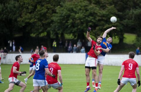 Hands Up! Ballintubber's Jason Gibbons and Matthew Macken of Claremorris duel in the middle of the field. Pictures: John Corless