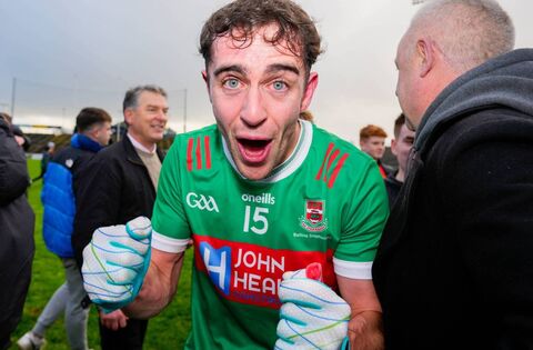 Ciaran Treacy celebrates Ballina's stunning victory. Picture: INPHO/James Lawlor