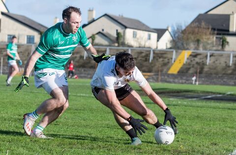 John McGlynn looks to scoop up the ball during last Sunday's thrilling win against Caltra. The Kilmeena attacker scored six points, including four from play. Picture: Martin McIntyre