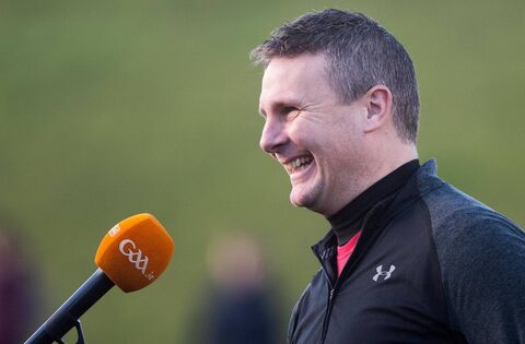 Damien Mulligan, in his previous capacity as Belmullet manager, speaks to TG4 in advance of the 2021 Mayo SFC Final at James Stephens Park, Ballina. Picture: INPHO/Evan Logan