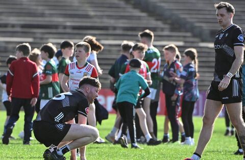 Sligo forwards Alan McLoughlin and Cian Lally, who scored 0-5 and 1-1 respectively, reflect on their side's loss, as in the distance Mayo's Fergal Boland poses for photographs with some young supporters. Picture: INPHO/Andrew Paton