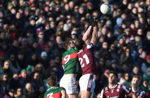 Mayo’s Matthew Ruane and Galway’s John Maher contest a kick-out at midfield during last Sunday's Allianz Football League Division 1 clash that attracted over 12,000 to Hastings Insurance MacHale Park, Castlebar. Picture: David Farrell Photography