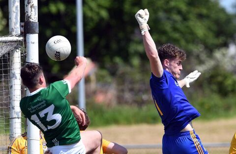 An anxious moment in the Knockmore defence as Charlestown's Matthew Lenehan has a goal effort rebound off the post during Sunday's Mayo SFL Division 1A clash at Fr O’Hara Park, Charlestown. Pictures: David Farrell Photography