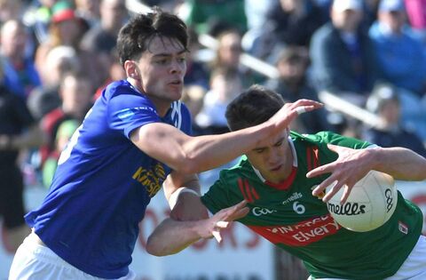 Mayo’s Sam Callinan manages to hold onto the ball as Cavan’s Oisin Brady attempts to block his path.