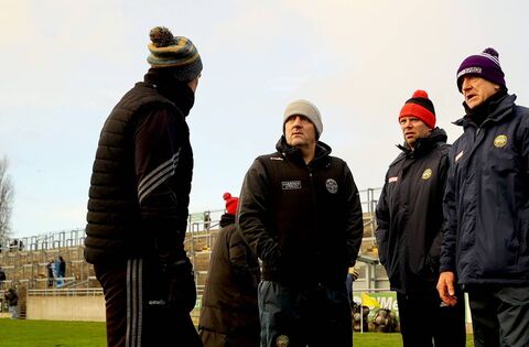 O'Byrne Cup, Bord na Mona O'Connor Park, Tullamore, Offaly 8/1/2022 Offaly vs Dublin Offaly selectors Gerry O’Malley, Kevin Guing, Tomas O’Se and manager John Maughan after the game Mandatory Credit ©INPHO/James Crombie