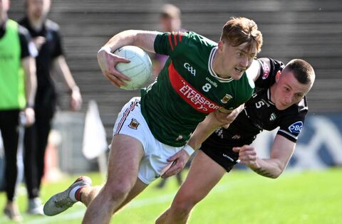 Jack Carney of Mayo takes on Sligo corner-back Brian Cox. Picture: INPHO/Andrew Paton