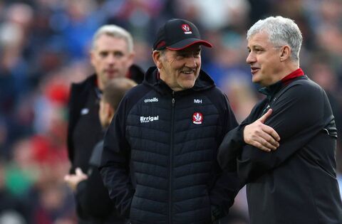 Mayo manager Kevin McStay shares a lighthearted moment with Mickey Harte during this year's visit of Derry to Castlebar in the All-Ireland SFC preliminary quarter-final Picture: .INPHO/James Crombie