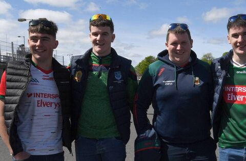 Cheering on Mayo in Hastings Insurance MacHale Park, last Sunday were Noel, Brian and Jamie O’Malley with Kevin Sweeney. Picture: David Farrell Photography