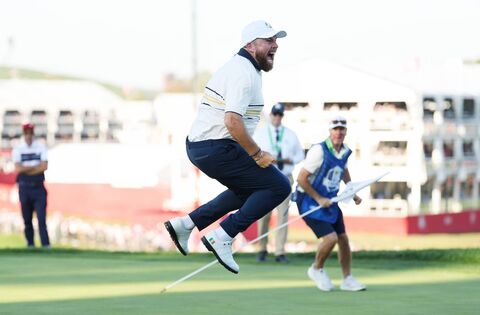 Offaly's Shane Lowry celebrates making his putt to halve the hole and retain the Ryder Cup for Team Europe on the 18th green during the Sunday singles matches at Bethpage State Park Golf Course, New York. Picture: Richard Heathcote/Getty Images