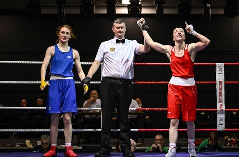Shannon Sweeney of St Anne's BC, right, celebrates after victory over Rachel Lawless of St Brigid's in Edenderry, Offaly, during the 51kg quarter-final bout on day one of the 2026 National Elite Boxing Championships at the National Stadium in Dublin. Picture: Piaras Ó Mídheach/Sportsfile