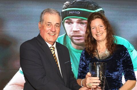 Rachel Sweetman accepts the Sports Personality of the Year award on behalf of her son, Caelan Doris, from RTÉ broadcaster Ger Canning at last Friday night's Western People Mayo Sports Stars Awards at Breaffy House Hotel. Picture: Michael Donnelly