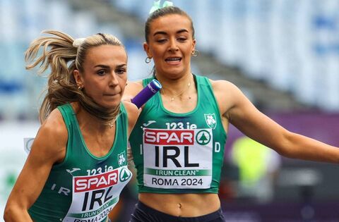 Lauren Cadden from Skreen in West Sligo passes the baton to Sharlene Mawdsley during the semi-final of the Women’s 4x400m relay at the 2024 European Athletics Championships in Rome last week. Picture: INPHO/Morgan Treacy