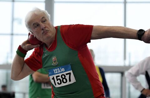 Martin Peyton of Mayo AC competing in the men's over 70 shot put at last Saturday's 123.ie National Masters Indoor Championships at the TUS International arena in Athlone. Picture: Tyler Miller/Sportsfile