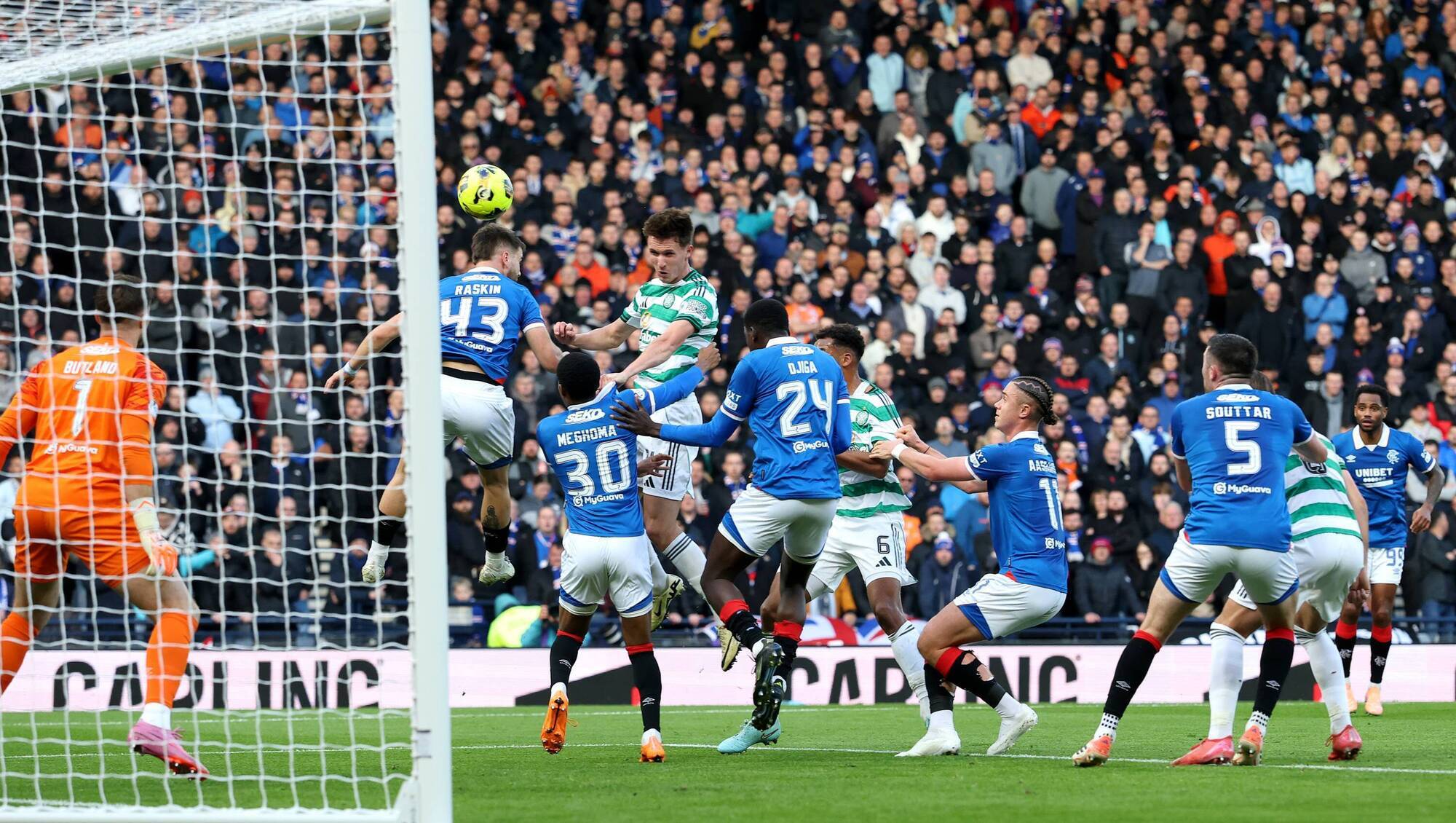 Johnny Kenny from Riverstown, Co Sligo rises to head Celtic's opening goal in last Sunday's Premier Sports Cup semi-final win against Rangers at Hampden Park. Kenny has scored three goals in Martin O'Neill's first two games in temporary charge. Picture: Ian MacNicol/Getty Images