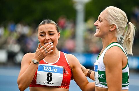 Sarah Quinn of St Colmans South Mayo AC, left, is congratulated by Sarah Lavin of Emerald AC, Limerick, after finishing third in the senior women's 100m hurdles final during day two of the 153rd 123.ie National Track & Field Senior Championships at Morton Stadium in Dublin. Picture: Sam Barnes/Sportsfile