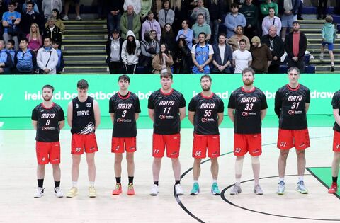 The Mayo Meteors' team prior to tip-off in last Friday night's Basketball Ireland Development League Men's Plate Final against Dublin Raiders. Picture: INPHO/Bryan Keane
