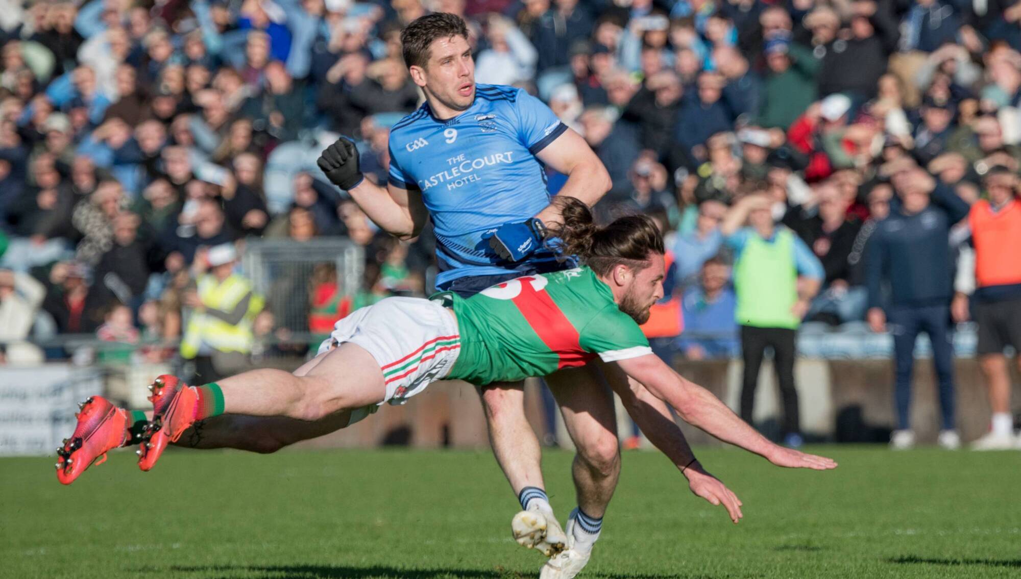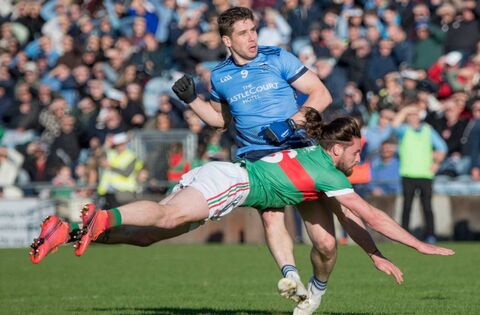 Padraig O'Hora of Ballina Stephenites attempts to prevent Lee Keegan from scoring in last Sunday's Connacht Gold Mayo SFC Final at Hastings Insurance MacHale Park in Castlebar. Keegan did in fact land Westport's opening score but the tackle resulted in both he and O'Hora departing the match through injury. Picture: Martin McIntyre