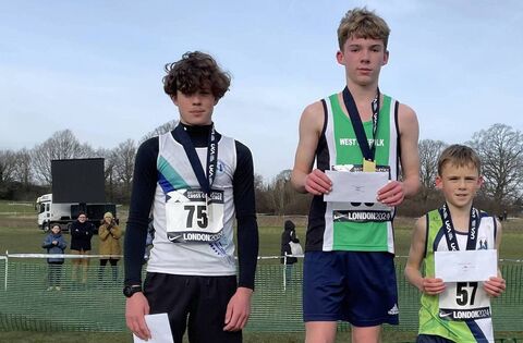 Daniel Gallagher, on the right, receiving his bronze medal win in the London Cross Country Challenge in Parliament Hill.