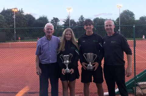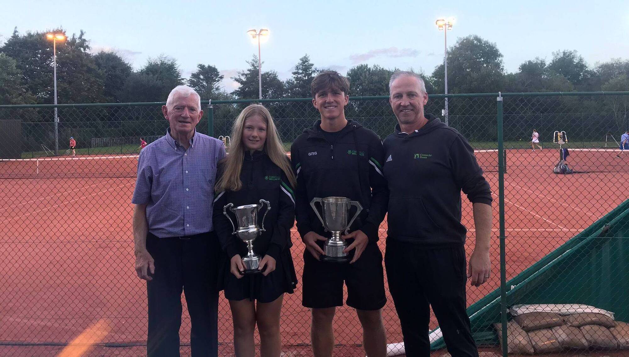 Paul Gavin, president of Castlebar Tennis Club, and head coach Garreth Barry, with Lauren Dunne and Eoghan Jennings who won the U16 girls and U18 boys singles titles at the Junior Lawn Tennis Championships of Ireland.