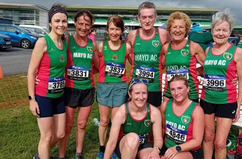 The Mayo AC tea, who took part in the Castlegar AC races in Ballybrit. Back row, from left: Donna Gallagher, Colette Tuohy, Angela O’Connor, Paraic Sweeney, Breege Blehein and Mags Glavey. Front row: Eimear Fitzmaurice and Katie Gibbons.