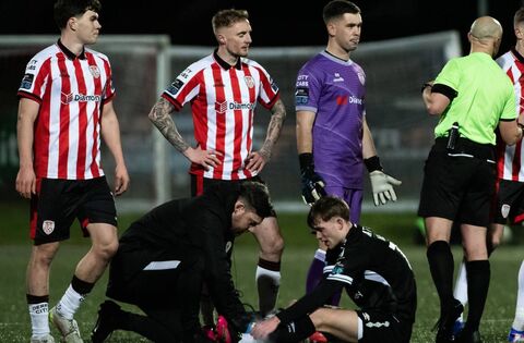 Derry City’s Carl Winchester, James Clarke, Brian Maher and James McClean appeal to referee Neil Doyle after an injury to Sligo Rovers’ Alex Nolan at the Ryan McBride Brandywell Stadium last Friday night. Picture: INPHO/Evan Logan