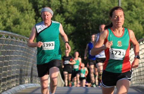Castlebar 5k women's race winner Colette Tuohy leads Evin McHale over Lough Lannagh bridge